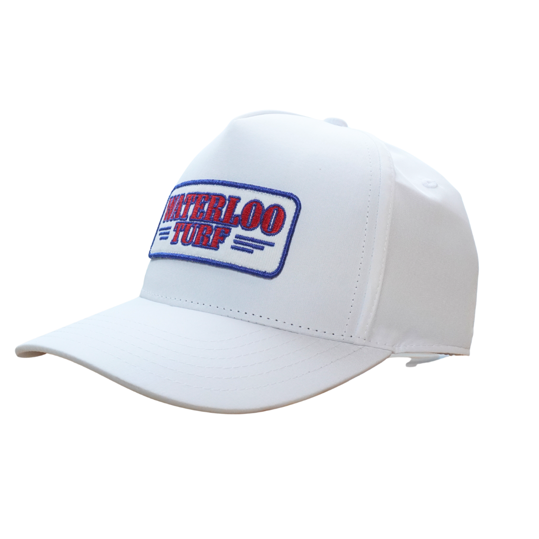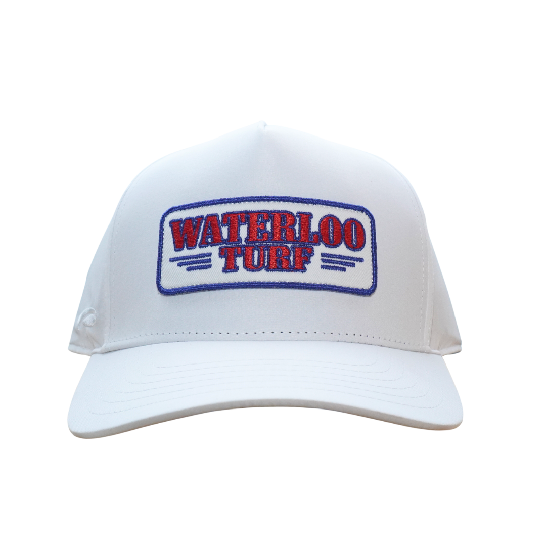 Bold and classic, the Waterloo Turf “Always Saturday” Cap delivers a clean look with standout style. Built with crisp white nylon panels and a structured 5-panel fit, this mid-crown cap features a curved visor and adjustable snapback for all-day comfort. The embroidered Waterloo Turf patch pops in red and royal blue, making it a go-to piece for game days, weekends, and everyday wear.