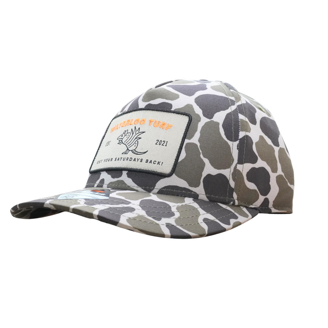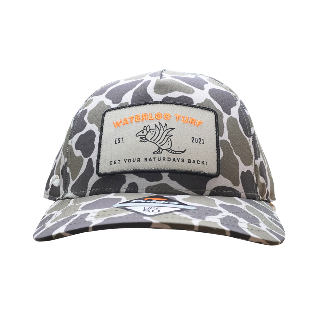 Blend in while standing out. The Waterloo Turf “Yard Boss” Trucker Hat brings together rugged outdoor style and everyday comfort. Featuring a khaki/olive/brown all-over camo design with a structured 5-panel fit, curved visor, and breathable mesh back, it’s built for shade and all-day wear. Finished with our signature Waterloo Turf armadillo patch and “Get Your Saturdays Back!” motto, this hat is a must-have for turf lovers and weekend warriors alike.